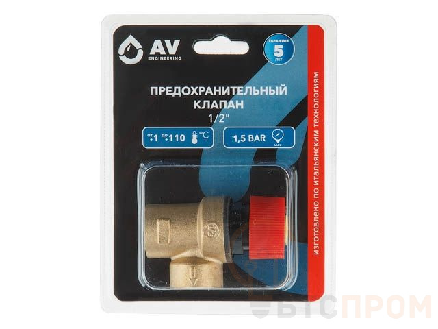 Предохранительный клапан 1/2" вн.-вн. 1,5 Бар, AV Engineering (инд. упак.) (Латунь, макс. 16 бар, макс. 110 °С) AVE3690115