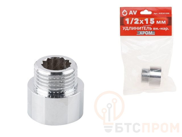 Удлинитель 1/2" вн.-нар. х 15 мм усиленный ХРОМ, AV Engineering (инд. упак.) (Латунь, макс. 16 бар, макс. 110 °С) AVE301008