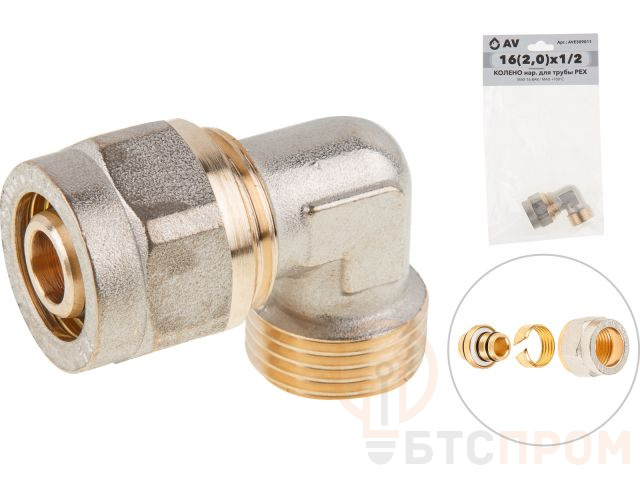 Колено 16(2.0) х 1/2" нар. для труб PEX, AV Engineering (инд. упак.) (для металлопластиковых и PEX труб) AVE309011