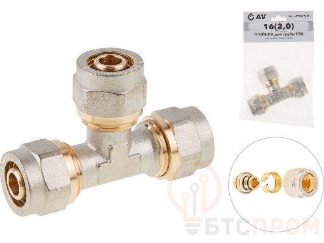 Тройник 16(2.0) для труб PEX, AV Engineering (инд. упак.) (для металлопластиковых и PEX труб) AVE309006