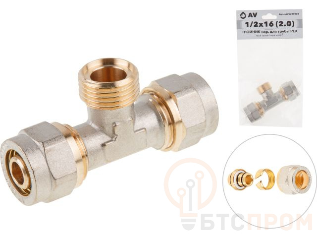 Тройник 16(2.0) х 1/2" нар. х 16(2.0) для труб PEX, AV Engineering (инд. упак.) (для металлопластиковых и PEX труб) AVE309008