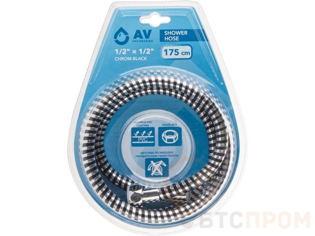 Шланг душевой, PVC, 1/2" г-г 175 см, хром-черн., AV Engineering (Гайка лаутнь (anti-twist), 10 бар) AVSSS-108