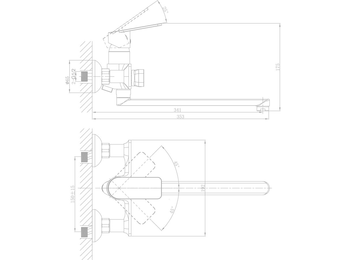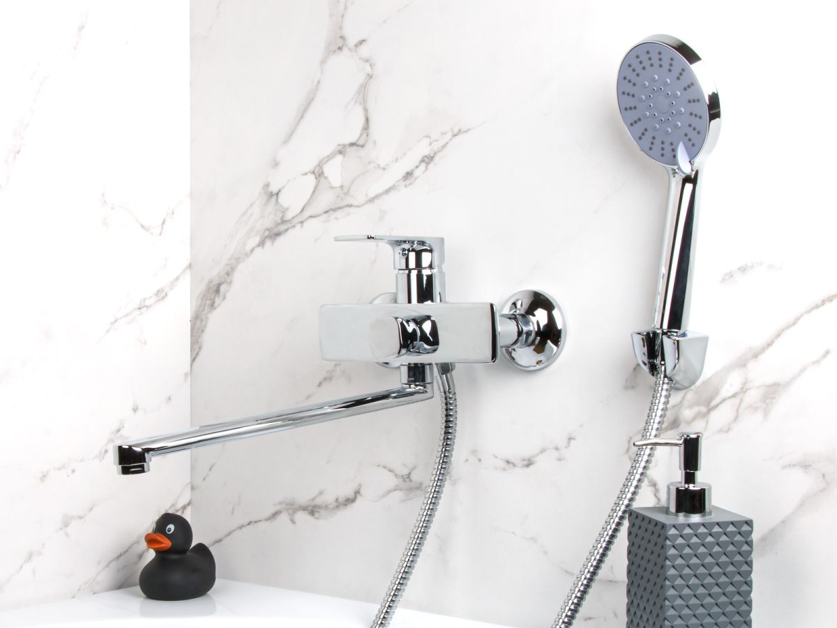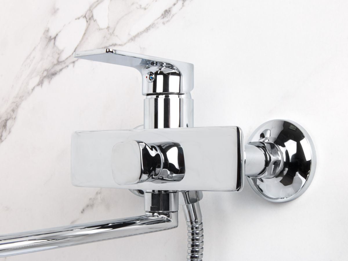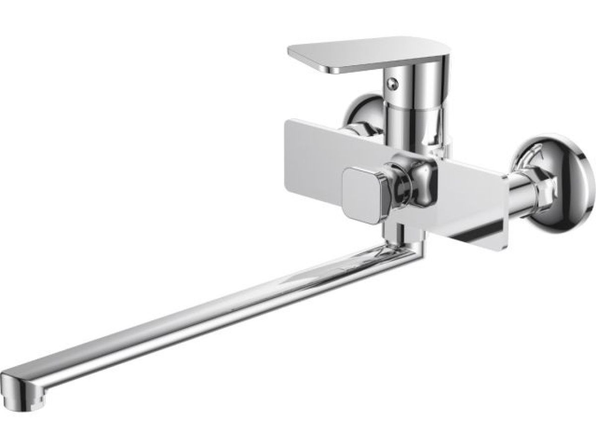 Смеситель для ванны (Lt) D35, серия Camellia хром, a-five (На стену, Длинный поворотный L-излив 341 мм. Лейка и шланг в комплекте) A5-0433