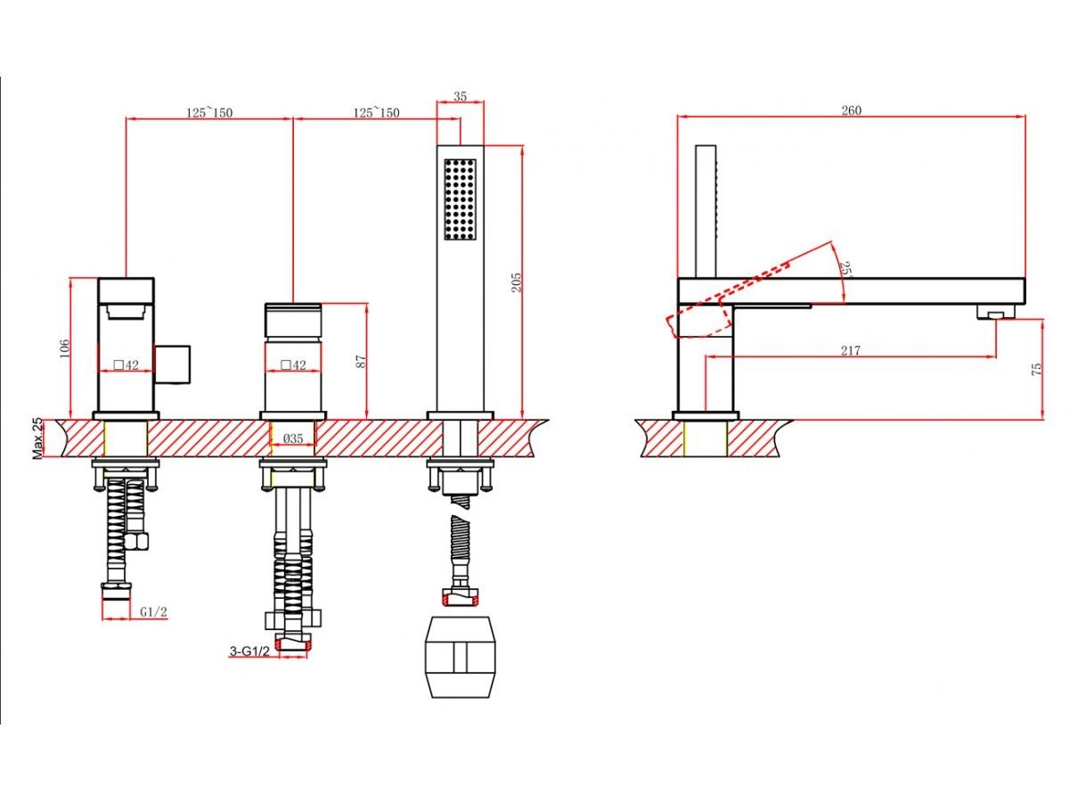 Угол поворота рукоятки вертик.: 25°;