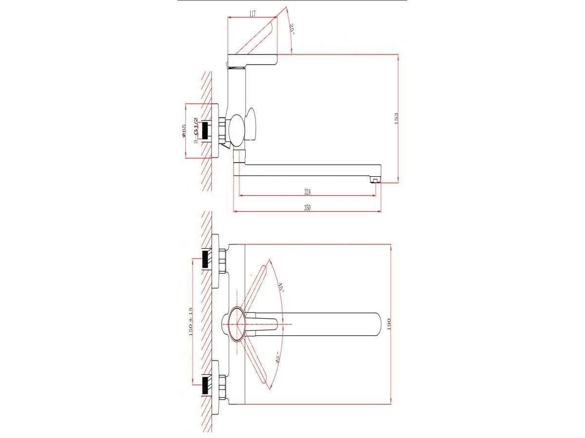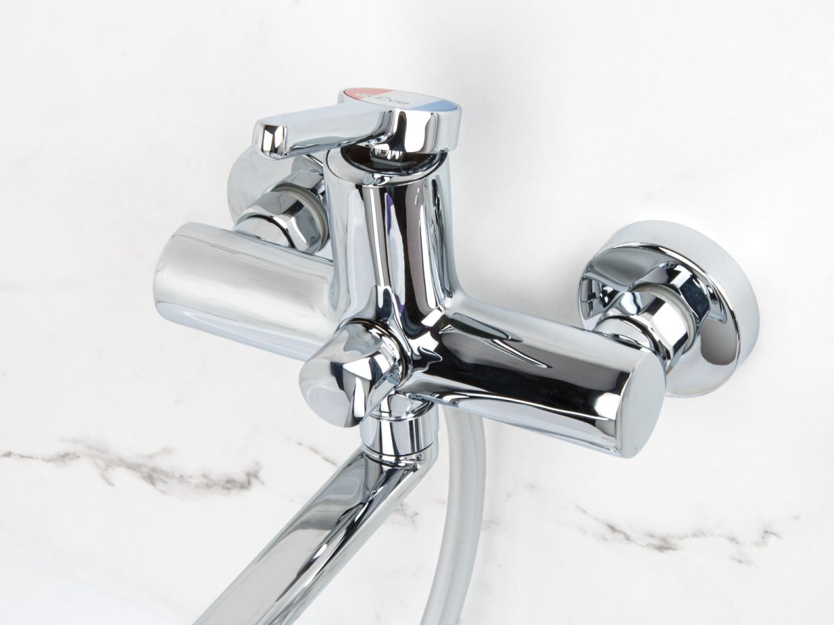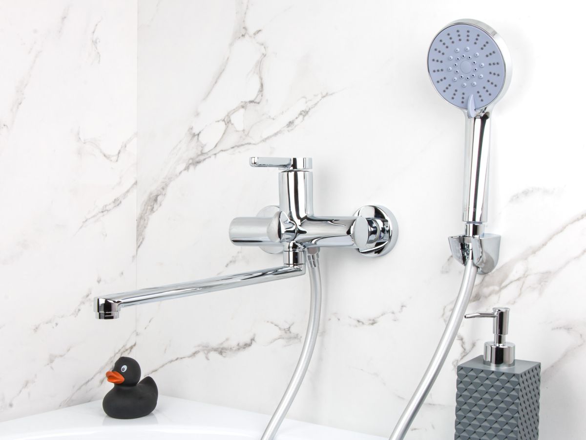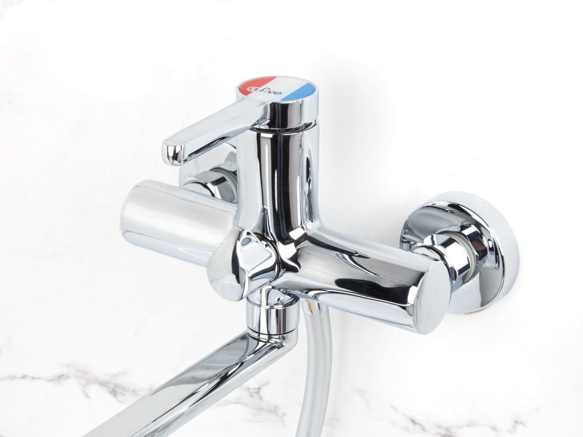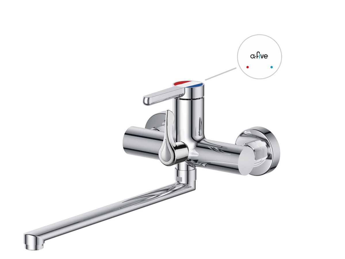 Смеситель для ванны (Lt) D35, серия Lotus хром, a-five (На стену, L-излив 350 мм., поворотный. Лейка и шланг в комплекте) A5-0533