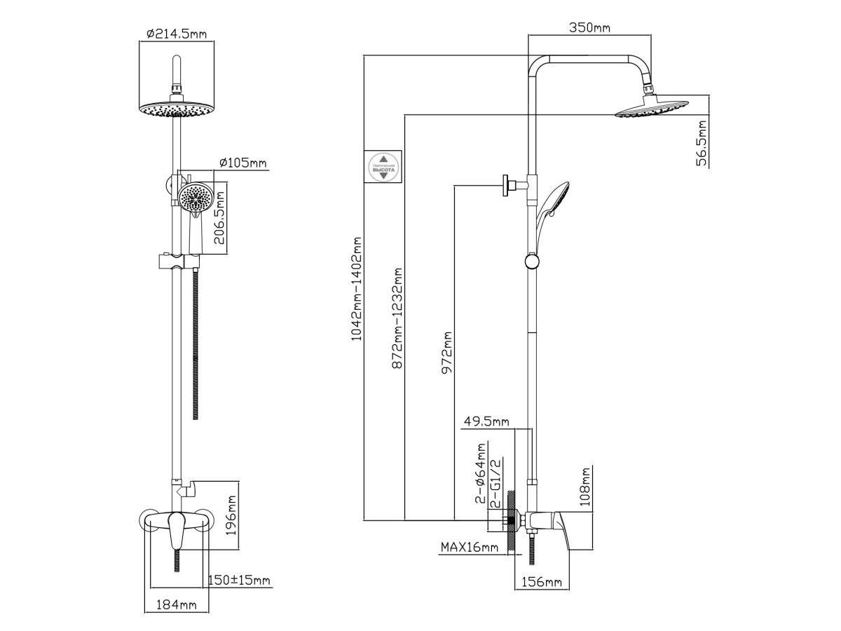 Душевая штанга, мм: регулиремая высота 1042 - 1402;