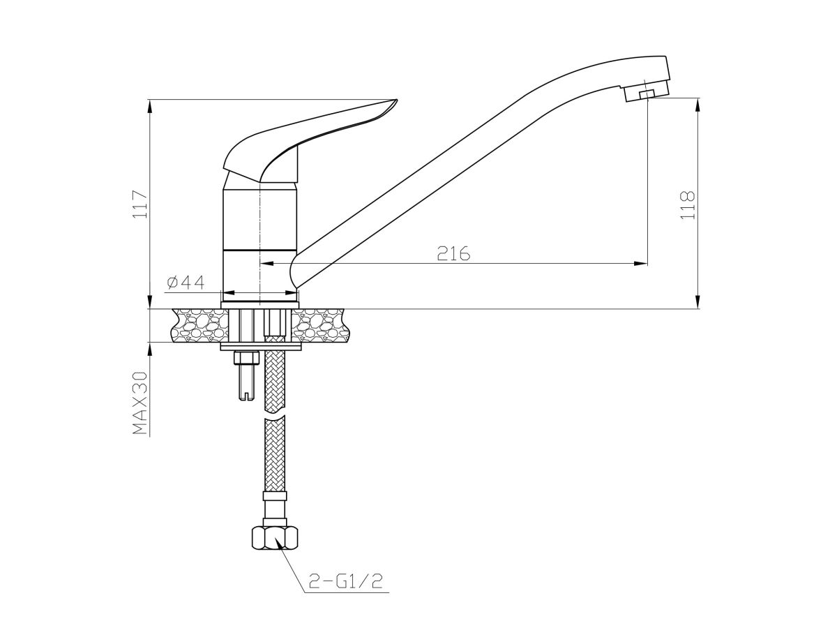Смеситель для кухни (Lt) D35, серия KOR AV Engineering (Длинный L-излив, длина 216 мм, высота 118 мм, поворотный) AVKOR4-A138-212
