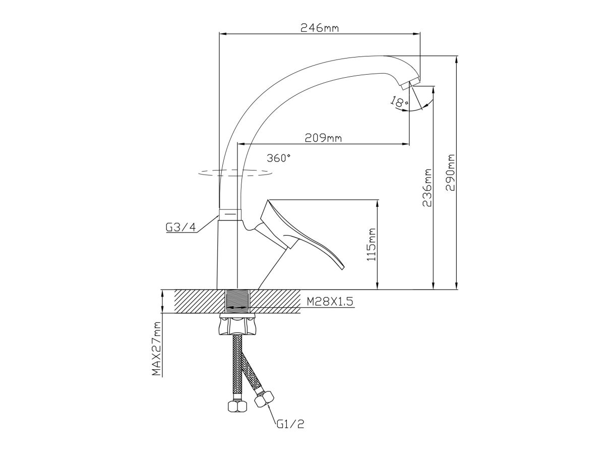 Смеситель для кухни (Lt) D40, серия JAS AV Engineering (С-излив, длина 209 мм, высота 236 мм, поворотный) AVJAS4-A080-559