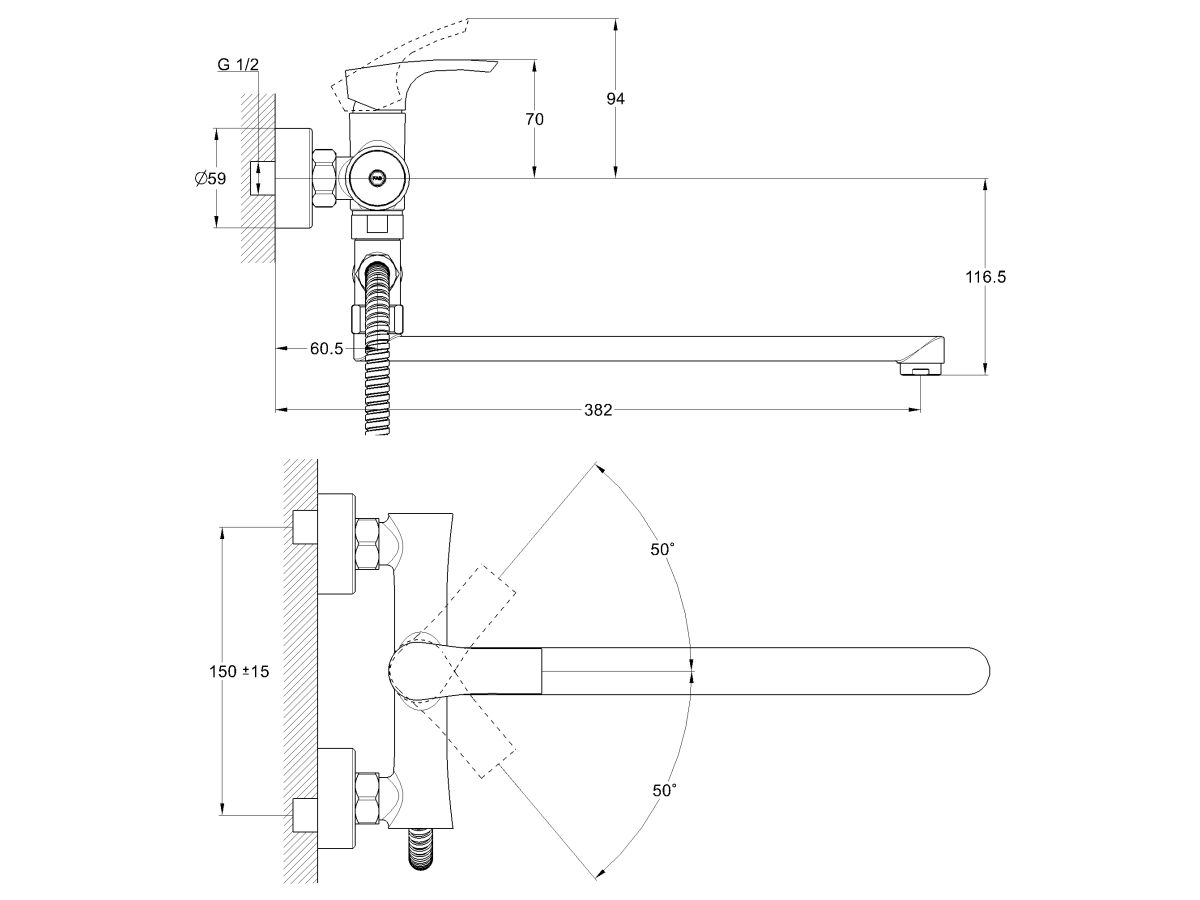 Смеситель для ванны D25-B, серия 580 ECONOCE (Длинный L-излив, длина 382 мм, лейка и шланг в комплекте, поворотный) EC0583