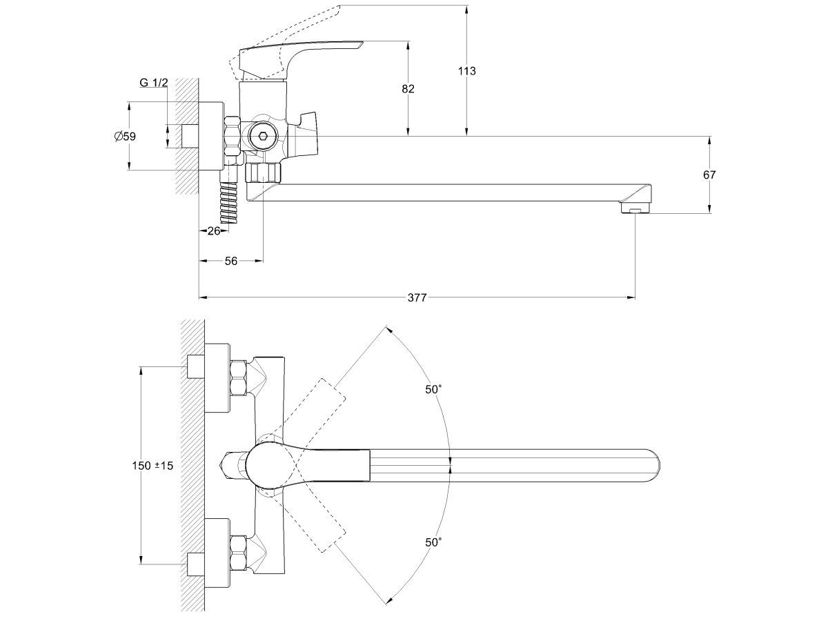 Угол поворота рукоятки гор.: 50°;
