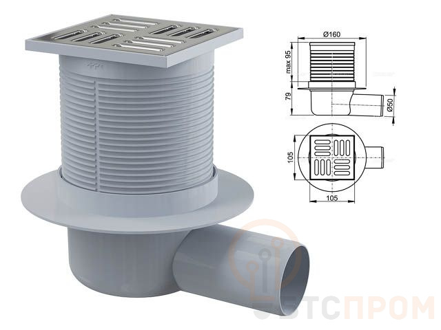 Сливной трап 105х105/50, подводка-боковая, решетка-нерж.сталь, гидрозатвор-комбинированый, Alcaplast APV31-BL-01