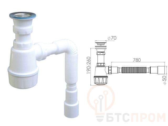 Сифон для кухни с прикручивающимся выпуском 70мм, с гибкой трубой 1 1/2" - 40/50мм, AV Engineering AVE129760