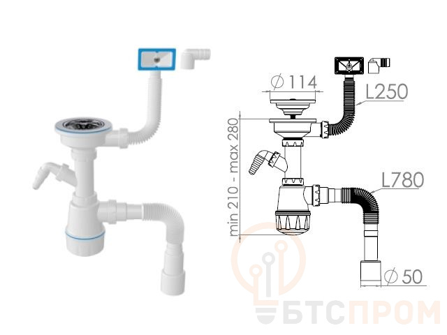 Сифон для кухни с прямоугольным переливом , выпуск 3 1/2, с гибкой трубой 1 1/2" - 40/50мм, AV Engin (AV Engineering) AVE129740