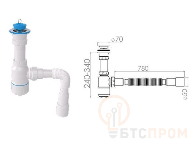 Сифон для умывальника с прикручивающимся выпуском 70мм , с гибкой трубой 1 1/2" - 40/50мм, AV Engine (AV Engineering) AVE129752