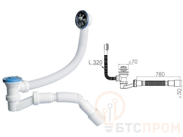 Сифон для ванны низкий h 120mm, метал. цепочкой, выпуск 70 мм, с гибкой трубой 40х40/50, AV Engineer (AV Engineering) AVE129731