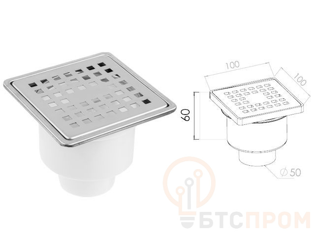 Сливной трап вертикальный D 50 с сухим затвором, с рамкой, решетка нерж. 100х100 мм, AV Engineering AVE5010101