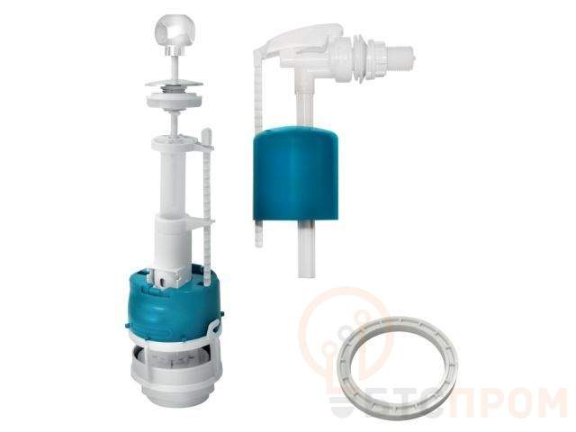 Комплект арматуры для бачка к унитазу. Сливной клапан СБа штоковый (для слива необходимо поднять ручку вверх и отпустить). Система СТОП ПОТОК (при нажатии на шток в любой момент смыва вода перестанет сливаться).