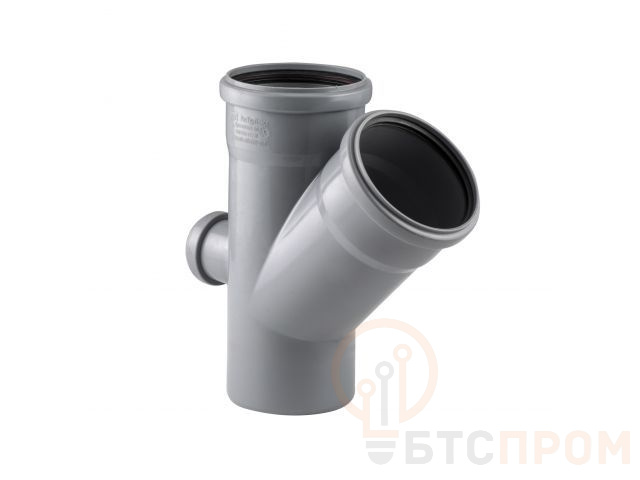 Крестовина двухплоскостная канализационная Ростурпласт диаметром 110 мм под углом 45 градусов для монтажа систем внутренней канализации. Имеет выход с левой стороны под трубу 50 мм