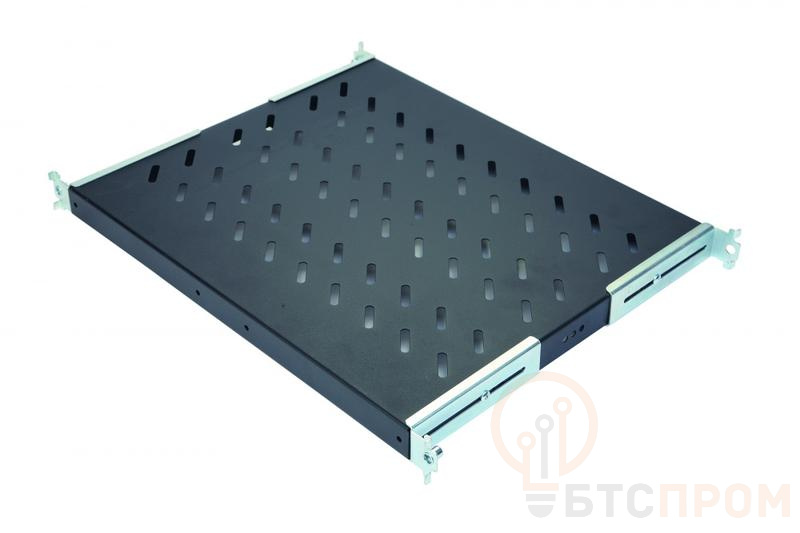 Полка стационарная регулируемая (далее – изделие) предназначена для размещения нестандартного оборудования, которое требует периодического обслуживания, а также для временного размещения диагностического и монтажного оборудования. Изделие изготовлено из стали 1,5 мм. Изделие перфорированное, цвет черный RAL 9005. В состав изделия входят монтажные кронштейны и комплект крепежа, предназначенные для крепления полки на вертикальных 19” направляющих шкафа (стойки) в четырех местах.