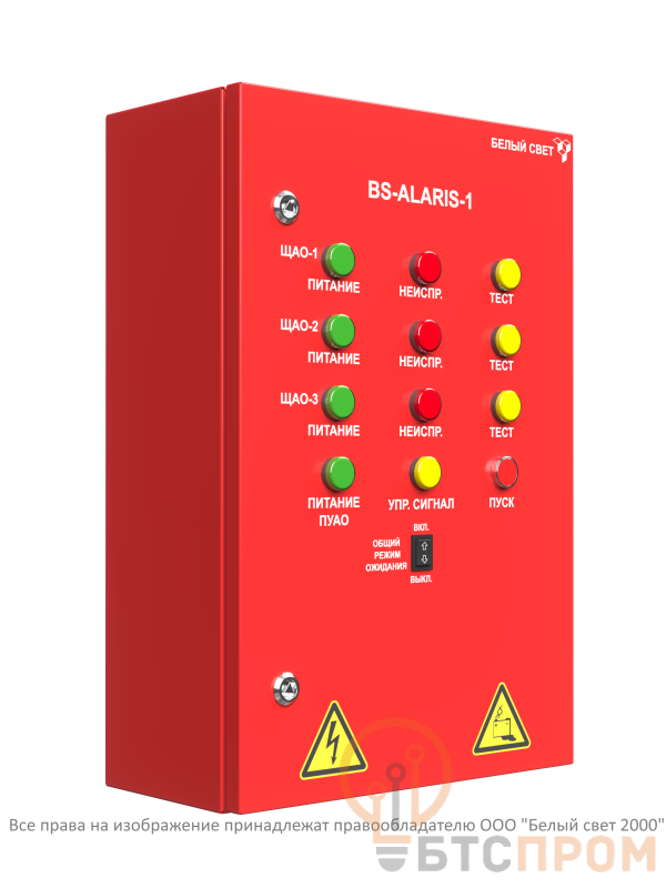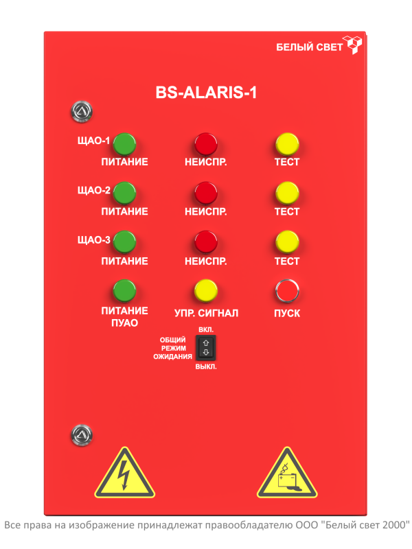 Пульт управления аварийным освещением предназначен для удаленного управления световыми приборами аварийного освещения.Имеет функции ручного включения аварийного режима, индикации основных состояний системы аварийного освещения (дублирование индикации со всех щитов аварийного освещения AKTEON-1). Индикаторы и кнопки управления на оперативной панели Индикаторы: ИНДИКАТОРЫ: "Питание, Неиспр., Тест, Питание ПУАО, Упр. Сигнал, Заряд АКБ", КНОПКИ: "Общий режим ожидания ВКЛ./ВЫКЛ., Пуск". Входные сигналы индикации: Потенциал: ~230V индикация "Питание", "Неисправность", "Тест". Диапазон номинального напряжения питания, В ~207?253 Установка производиться на ровной вертикальной поверхности стены.