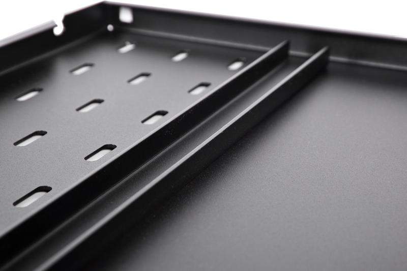 Глубина полки составляет 750 мм, что подходит для большинства моделей стоек. Полка имеет черное покрытие методом цинк-хроматного монофосфатирования (ЦМО), которое обеспечивает эффективную антикоррозийную защиту и увеличивает срок службы в условиях интенсивной эксплуатации. Монтаж осуществляется быстро и легко с помощью винтового крепления.