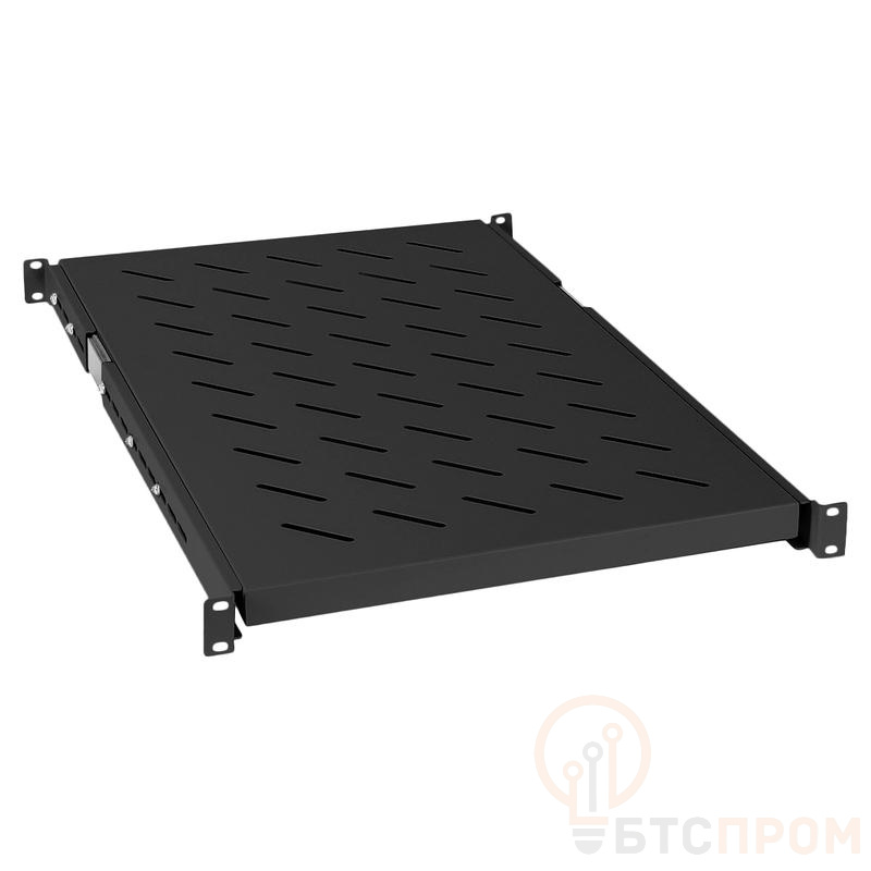 Полка выполнена из высококачественной стали с порошковым покрытием черного цвета (RAL 9004), что обеспечивает устойчивость к коррозии, механическим повреждениям и долговечность даже при интенсивной эксплуатации. Модель оснащена плавными и надежными направляющими полного выдвижения, что обеспечивает легкий и комфортный доступ ко всему установленному на ней оборудованию — коммутаторам, маршрутизаторам, патч-панелям, блокам питания и другим устройствам.
