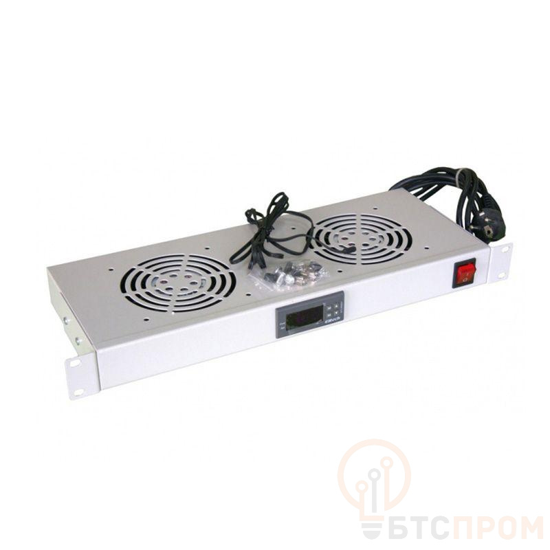 Вентиляторный модуль используется для обеспечения принудительной вытяжки и притока воздуха к внутреннему пространству шкафа, а также для фильтрации подаваемого воздуха. Устанавливается на направляющие 19” шкафов. В конструкции предусмотрено 2 вентилятора, включение/выключение которых осуществляется посредством кнопки, находящейся на лицевой стороне изделия. Модуль оснащен автоматическим термостатом, контролирующим заданную температуру, и шнуром, через который устройство подключается к сети 220 В и обеспечивается электропитанием. Покрытие выполнено краской серого цвета. Воздушный поток – 210 м3/час. Диапазон регулировки температуры составляет от 0°С до 50°С. Воздушный поток: 210 м3/час. Уровень шума: 40 Дб. Диапазон регулировки температуры: от 0°С до 50°С Цвет: серый.