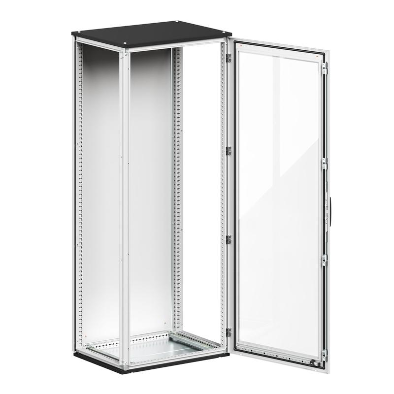 Комплекты напольных корпусов CQE N предназначены для построения систем автоматизации, управления, распределения энергии. Корпус поставляется в разборном виде и состоит из каркаса (крыша, основание, стойки), задней панели и стеклянной двери. Боковые панели не входят в комплект и приобретаются отдельно. Комплекты оптимизируют процесс закупки, позволяя заказывать полный набор компонентов под единым артикулом. Угол открытия двери – 130°. Степень защиты при использовании стандартных боковых панелей – IP55, со сплошным дном — IP65. Дверь оснащена накладкой под ключ с двойной бородкой. Каркас изготовлен из листовой стали 1,5 мм с порошковым покрытием. Ребра жесткости обеспечивают несущую способность до 1000 кг. Размер (ВхШхГ), мм: 1800х1000х400.