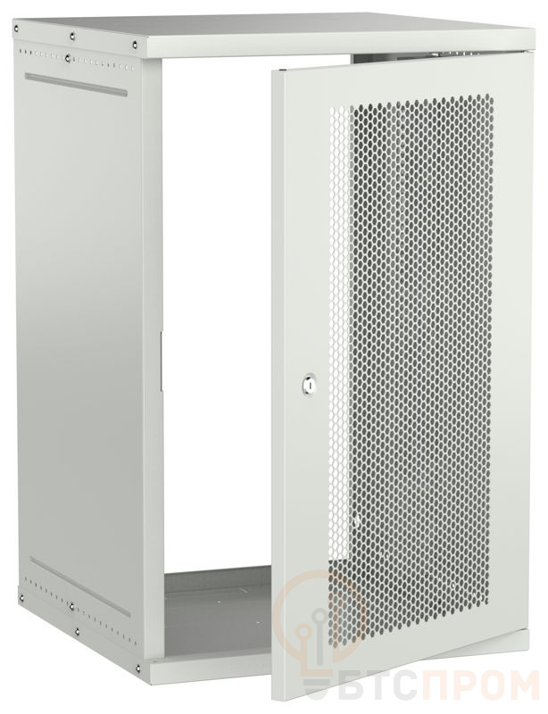 Ключевая особенность модели — перфорированная дверь, обеспечивающая эффективную вентиляцию и отвод тепла от установленных устройств. Конструкция выполнена из стали серого цвета, обладает высокой прочностью и предназначена для настенного монтажа, что экономит полезное пространство в помещении.