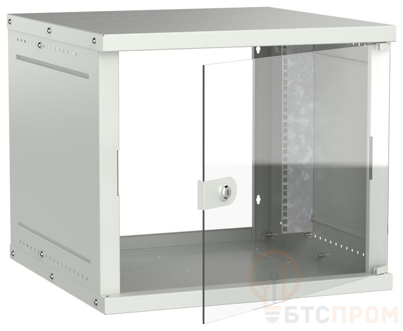 Передняя стеклянная дверь с замком позволяет визуально контролировать состояние оборудования, обеспечивая при этом защиту от несанкционированного доступа. Шкаф оснащен перфорированными боковыми панелями для эффективной вентиляции, регулируемыми монтажными стойками и возможностью настенного крепления.