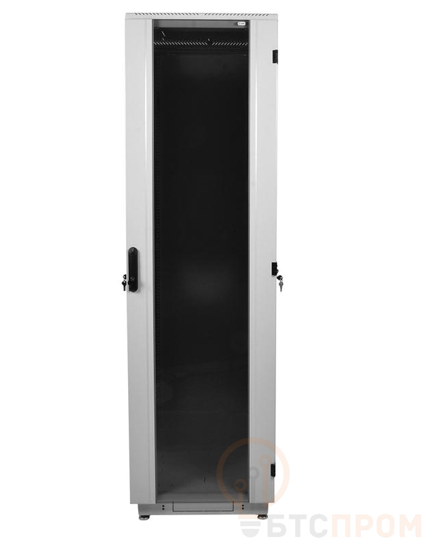 Конструкция включает переднюю дверь из закаленного стекла для визуального контроля и заднюю глухую стальную дверь. Комплектуется двумя съемными боковыми панелями, что облегчает монтаж. Шкаф рассчитан на нагрузку до 650 кг и оснащен перфорированными панелями для эффективной вентиляции.
