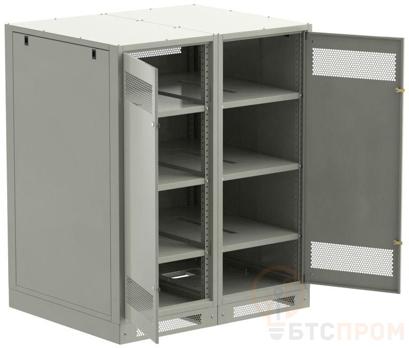 Шкаф аккумуляторный серии LINEA B предназначен для размещения и защиты от несанкционированного доступа аккумуляторных батарей (АБ). Шкафы LINEA B повышенной прочности со сварным каркасом и усиленными полками позволяют размещать АБ до 500 кг. на полке. Вместе со шкафом поставляются полки. Количество полок в комплекте зависит от высоты шкафа. Каркас позволяет размещать полки с шагом 30мм. В полках предусмотрены вырезы для удобства соединения АБ. В нижней части корпуса предусмотрена плата для установки предохранителя-выключателя-разъединителя ПВР. Шкаф аккумуляторный серии LINEA B двухсекционный поставляется на цоколе высотой 100мм. и состоит их двух секций. В месте эксплуатации требуется соединение секций метизами из комплекта поставки. Все металлические части шкафа LINEA B заземлены. В комплект включены РЫМ-болты для удобства перемещения шкафа. Вентиляционные отверстия в дверях и задней панели обеспечивают циркуляцию воздуха. Для преобразования шкафа аккумуляторного серии LINEA B в стеллаж требуется снять заднюю стенку, крышку, дверь(и), боковые стенки. Широкий ассортимент типоразмеров позволяет подобрать оптимальный шкаф под требуемое количество АБ.