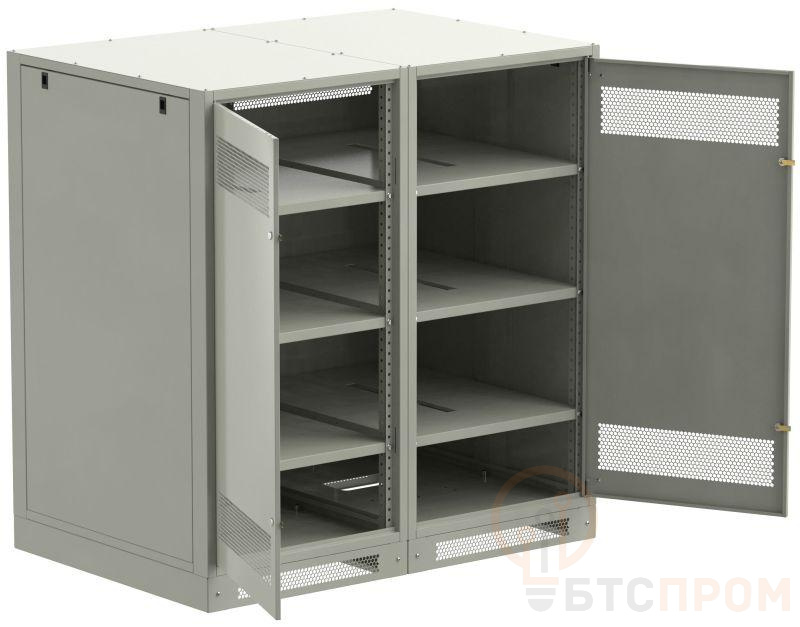 Шкаф аккумуляторный серии LINEA B предназначен для размещения и защиты от несанкционированного доступа аккумуляторных батарей (АБ). Шкафы LINEA B повышенной прочности со сварным каркасом и усиленными полками позволяют размещать АБ до 500 кг. на полке. Вместе со шкафом поставляются полки. Количество полок в комплекте зависит от высоты шкафа. Каркас позволяет размещать полки с шагом 30мм. В полках предусмотрены вырезы для удобства соединения АБ. В нижней части корпуса предусмотрена плата для установки предохранителя-выключателя-разъединителя ПВР. Шкаф аккумуляторный серии LINEA B двухсекционный поставляется на цоколе высотой 100мм. и состоит их двух секций. В месте эксплуатации требуется соединение секций метизами из комплекта поставки. Все металлические части шкафа LINEA B заземлены. В комплект включены РЫМ-болты для удобства перемещения шкафа. Вентиляционные отверстия в дверях и задней панели обеспечивают циркуляцию воздуха. Для преобразования шкафа аккумуляторного серии LINEA B в стеллаж требуется снять заднюю стенку, крышку, дверь(и), боковые стенки. Широкий ассортимент типоразмеров позволяет подобрать оптимальный шкаф под требуемое количество АБ.