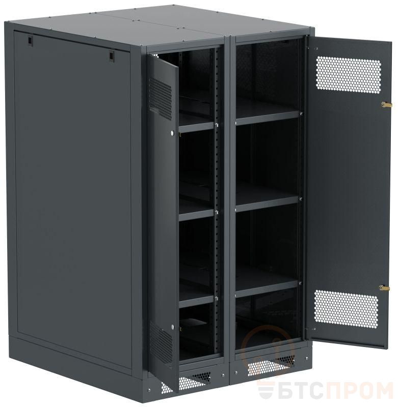 Шкаф аккумуляторный серии LINEA B предназначен для размещения и защиты от несанкционированного доступа аккумуляторных батарей (АБ). Шкафы LINEA B повышенной прочности со сварным каркасом и усиленными полками позволяют размещать АБ до 500 кг. на полке. Вместе со шкафом поставляются полки. Количество полок в комплекте зависит от высоты шкафа. Каркас позволяет размещать полки с шагом 30мм. В полках предусмотрены вырезы для удобства соединения АБ. В нижней части корпуса предусмотрена плата для установки предохранителя-выключателя-разъединителя ПВР. Шкаф аккумуляторный серии LINEA B двухсекционный поставляется на цоколе высотой 100мм. и состоит их двух секций. В месте эксплуатации требуется соединение секций метизами из комплекта поставки. Все металлические части шкафа LINEA B заземлены. В комплект включены РЫМ-болты для удобства перемещения шкафа. Вентиляционные отверстия в дверях и задней панели обеспечивают циркуляцию воздуха. Для преобразования шкафа аккумуляторного серии LINEA B в стеллаж требуется снять заднюю стенку, крышку, дверь(и), боковые стенки. Широкий ассортимент типоразмеров позволяет подобрать оптимальный шкаф под требуемое количество АБ.