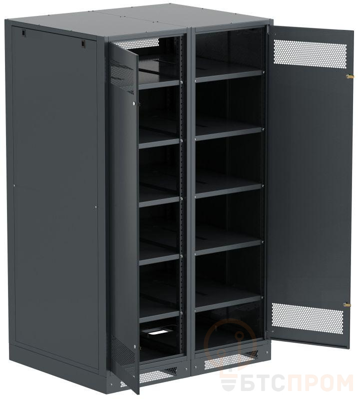 Шкаф аккумуляторный серии LINEA B предназначен для размещения и защиты от несанкционированного доступа аккумуляторных батарей (АБ). Шкафы LINEA B повышенной прочности со сварным каркасом и усиленными полками позволяют размещать АБ до 500 кг. на полке. Вместе со шкафом поставляются полки. Количество полок в комплекте зависит от высоты шкафа. Каркас позволяет размещать полки с шагом 30мм. В полках предусмотрены вырезы для удобства соединения АБ. В нижней части корпуса предусмотрена плата для установки предохранителя-выключателя-разъединителя ПВР. Шкаф аккумуляторный серии LINEA B двухсекционный поставляется на цоколе высотой 100мм. и состоит их двух секций. В месте эксплуатации требуется соединение секций метизами из комплекта поставки. Все металлические части шкафа LINEA B заземлены. В комплект включены РЫМ-болты для удобства перемещения шкафа. Вентиляционные отверстия в дверях и задней панели обеспечивают циркуляцию воздуха. Для преобразования шкафа аккумуляторного серии LINEA B в стеллаж требуется снять заднюю стенку, крышку, дверь(и), боковые стенки. Широкий ассортимент типоразмеров позволяет подобрать оптимальный шкаф под требуемое количество АБ.