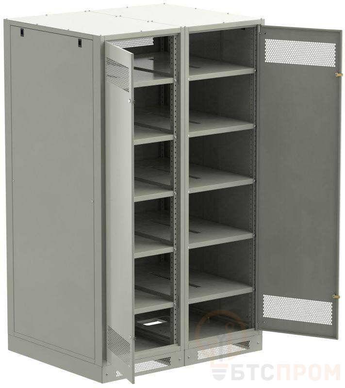 Шкаф аккумуляторный серии LINEA B предназначен для размещения и защиты от несанкционированного доступа аккумуляторных батарей (АБ). Шкафы LINEA B повышенной прочности со сварным каркасом и усиленными полками позволяют размещать АБ до 500 кг. на полке. Вместе со шкафом поставляются полки. Количество полок в комплекте зависит от высоты шкафа. Каркас позволяет размещать полки с шагом 30мм. В полках предусмотрены вырезы для удобства соединения АБ. В нижней части корпуса предусмотрена плата для установки предохранителя-выключателя-разъединителя ПВР. Шкаф аккумуляторный серии LINEA B двухсекционный поставляется на цоколе высотой 100мм. и состоит их двух секций. В месте эксплуатации требуется соединение секций метизами из комплекта поставки. Все металлические части шкафа LINEA B заземлены. В комплект включены РЫМ-болты для удобства перемещения шкафа. Вентиляционные отверстия в дверях и задней панели обеспечивают циркуляцию воздуха. Для преобразования шкафа аккумуляторного серии LINEA B в стеллаж требуется снять заднюю стенку, крышку, дверь(и), боковые стенки. Широкий ассортимент типоразмеров позволяет подобрать оптимальный шкаф под требуемое количество АБ.