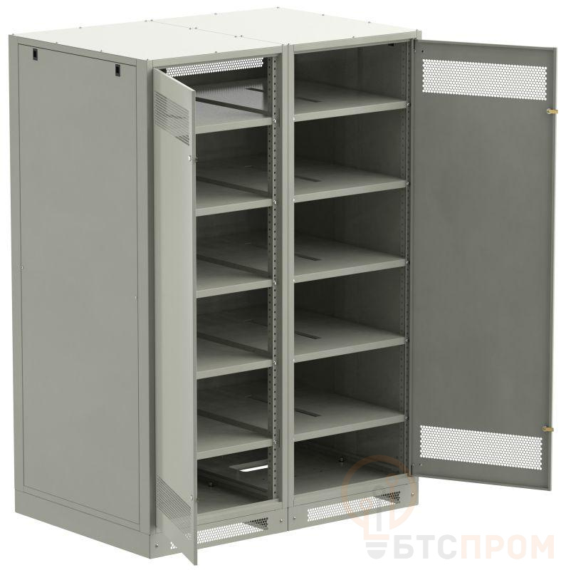 Шкаф аккумуляторный серии LINEA B предназначен для размещения и защиты от несанкционированного доступа аккумуляторных батарей (АБ). Шкафы LINEA B повышенной прочности со сварным каркасом и усиленными полками позволяют размещать АБ до 500 кг. на полке. Вместе со шкафом поставляются полки. Количество полок в комплекте зависит от высоты шкафа. Каркас позволяет размещать полки с шагом 30мм. В полках предусмотрены вырезы для удобства соединения АБ. В нижней части корпуса предусмотрена плата для установки предохранителя-выключателя-разъединителя ПВР. Шкаф аккумуляторный серии LINEA B двухсекционный поставляется на цоколе высотой 100мм. и состоит их двух секций. В месте эксплуатации требуется соединение секций метизами из комплекта поставки. Все металлические части шкафа LINEA B заземлены. В комплект включены РЫМ-болты для удобства перемещения шкафа. Вентиляционные отверстия в дверях и задней панели обеспечивают циркуляцию воздуха. Для преобразования шкафа аккумуляторного серии LINEA B в стеллаж требуется снять заднюю стенку, крышку, дверь(и), боковые стенки. Широкий ассортимент типоразмеров позволяет подобрать оптимальный шкаф под требуемое количество АБ.