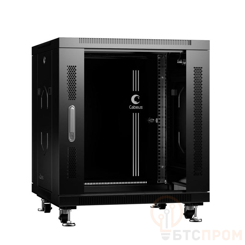 Шкаф монтажный телекоммуникационный напольный SH-05C-12U60/60-BK 19дюйм для распред. и серверн. оборудования 12U 600х600х730мм передн. стеклян. и задн. сплошн. метал. двери ручка с замком черн. (RAL 9004) Cabeus 8554c