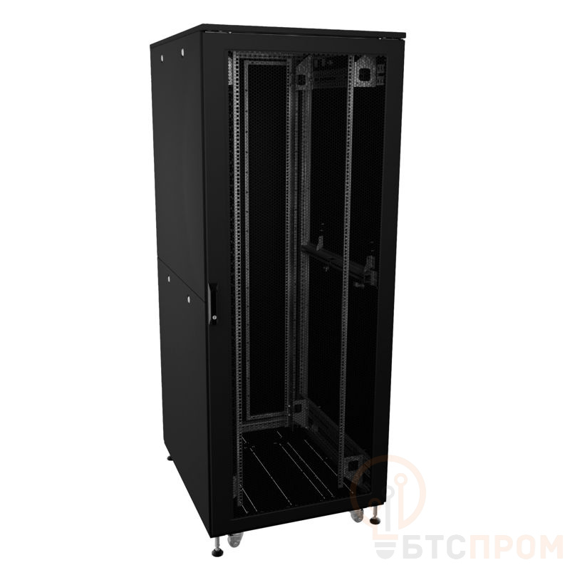 Конструкция отличается повышенной надежностью: двойные перфорированные боковые панели и перфорированная дверь обеспечивают эффективный воздухообмен и защиту от перегрева. Крышка шкафа имеет технологические вырубки для удобства кабельного ввода. Модель поставляется в разобранном виде, что упрощает транспортировку и позволяет произвести сборку непосредственно на объекте. Все элементы выполнены в строгом черном цвете (RAL9005).