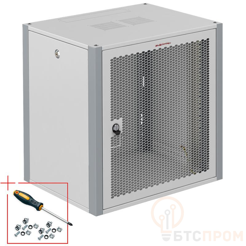Корпус шкафа выполнен из холоднокатаной стали и имеет степень защиты IP55, что гарантирует полную защиту от пыли и мощных водяных струй. Дверца оснащена замком с ключом для ограничения несанкционированного доступа. Конструкция включает перфорированные двери для эффективной вентиляции и боковые панели, легко снимающиеся для удобного монтажа.