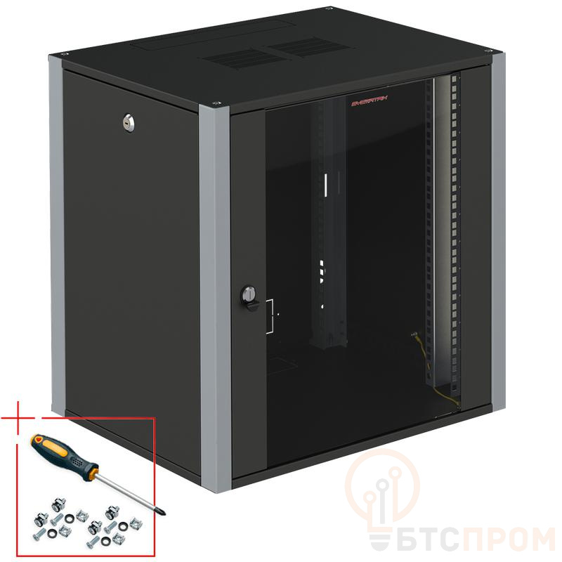 Шкаф выполнен из холоднокатаной стали с порошковым покрытием, что обеспечивает высокую стойкость к коррозии и механическим воздействиям. Модель оснащена перфорированными дверьми для эффективной вентиляции, запирающимися дверцами для контроля доступа и регулируемыми монтажными стойками с шагом крепления 1U. Закаленное стекло в дверце позволяет визуально контролировать состояние оборудования без открывания шкафа.