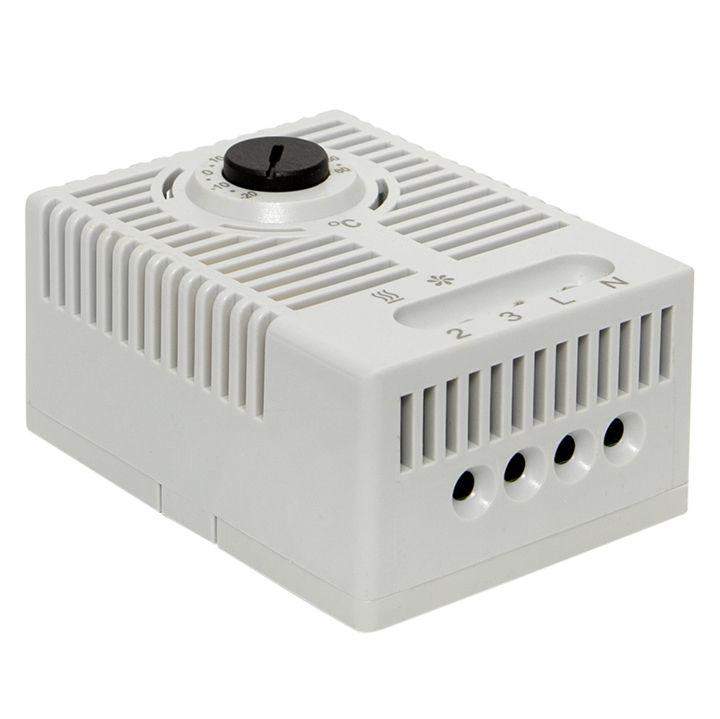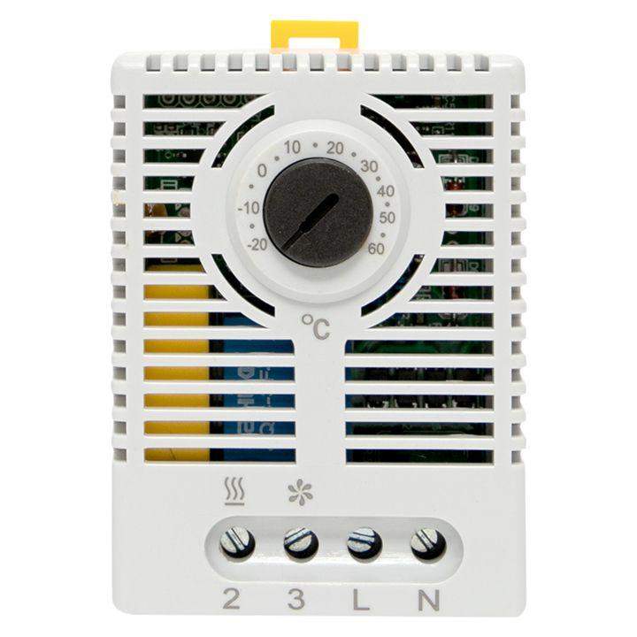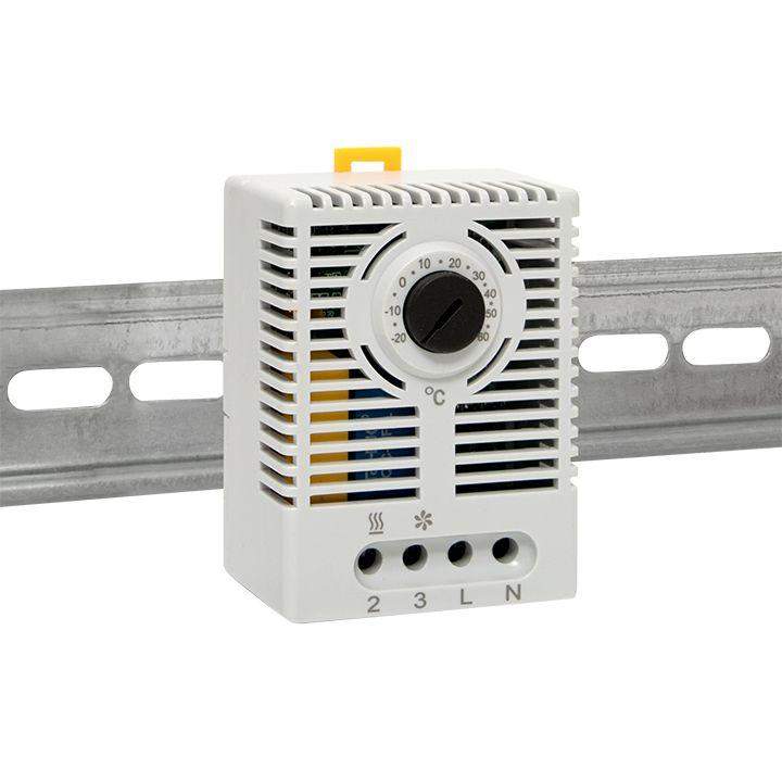 Термостат предназначен для поддержания фиксированной температуры внутри электрощитов. Предназначен для управления исполнительными устройствами: обогревателями и вентиляторами. А так же, для оповещения о превышении предельной температуры. Нормально-замкнутый контакт (NC) используется для регулирования нагревателей. Нормально-разомкнутый контакт (NO) – для регулирования вентиляторов, или для включения сигнальных датчиков при превышении температуры.