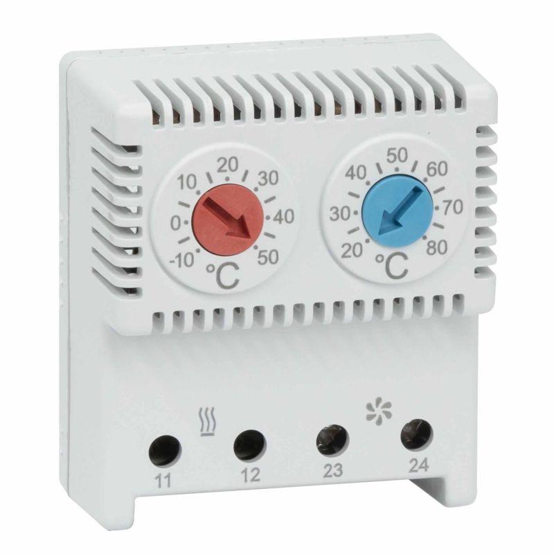 Термостат с широким диапазоном регулирования температур предназначен для автоматического контроля и поддержания заданной температуры внутри электротехнических шкафов. Прибор оснащен нормально закрытым контактом (NC) и нормально открытым контактом (NO), которые обеспечивают эффективное управление микроклиматом. Термостат выполнен в современном дизайне, обладает отличной визуализацией и простой, понятной настройкой.