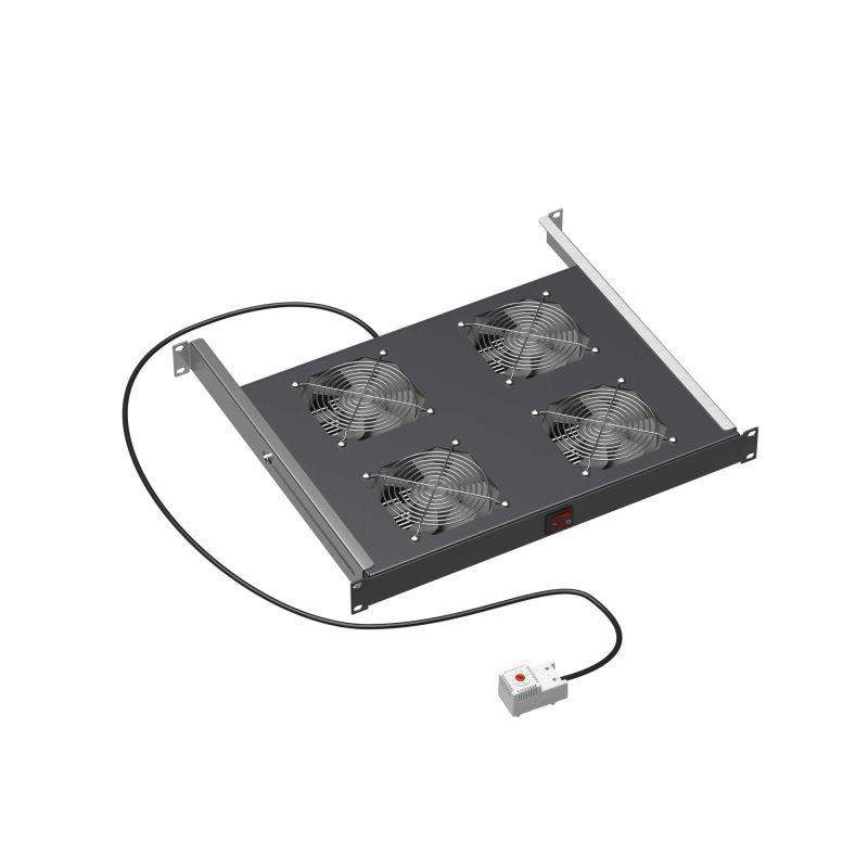 Вентиляторные модули для 19" IT-корпусов ДКС серии CQE и STI предназначены для принудительной вентиляции внутреннего объема корпуса с целью поддержания нормальных условий эксплуатации установленного активного сетевого оборудования. Вентиляторные блоки монтируются в юнитовое пространство 19” IT-корпуса на передние и задние вертикальные монтажные профили с помощью стандартного крепежа винт М6 – чашеобразная пластиковая шайба – закладная гайка М6. Модули поставляются в комплекте с термостатом или без него, в зависимости от решаемой задачи. 4 вентилятора. Цвет - черный, RAL 9005.