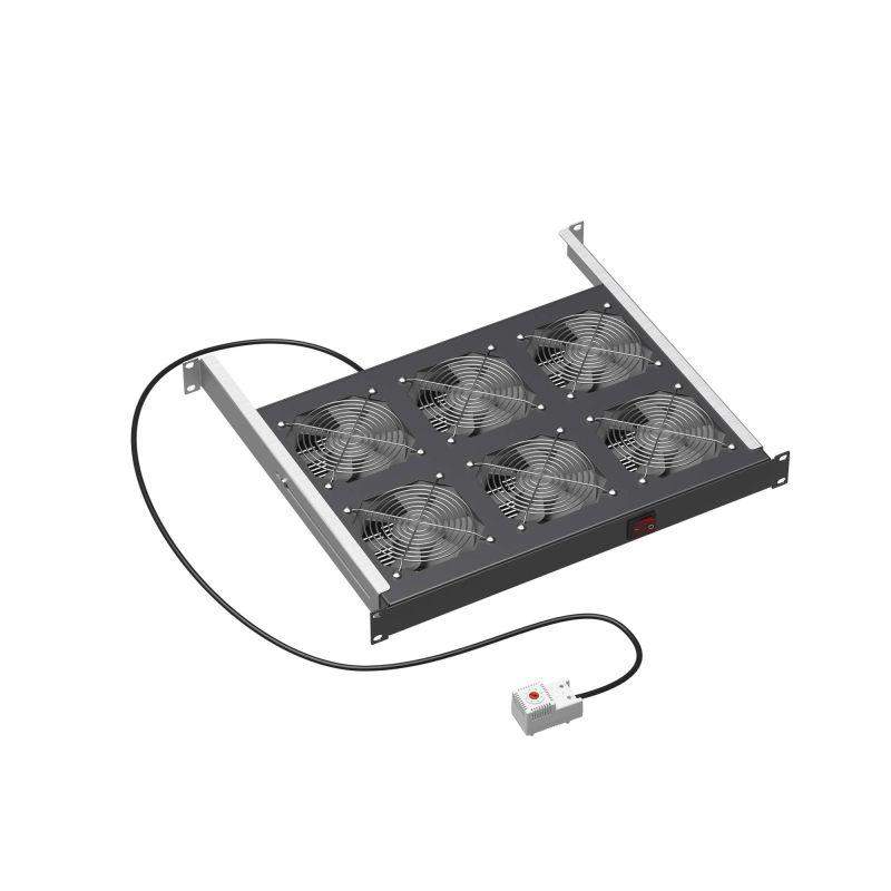 Вентиляторные модули для 19" IT-корпусов ДКС серии CQE и STI предназначены для принудительной вентиляции внутреннего объема корпуса с целью поддержания нормальных условий эксплуатации установленного активного сетевого оборудования. Вентиляторные блоки монтируются в юнитовое пространство 19” IT-корпуса на передние и задние вертикальные монтажные профили с помощью стандартного крепежа винт М6 – чашеобразная пластиковая шайба – закладная гайка М6. Модули поставляются в комплекте с термостатом или без него, в зависимости от решаемой задачи. 6 вентиляторов. Цвет - черный, RAL 9005.