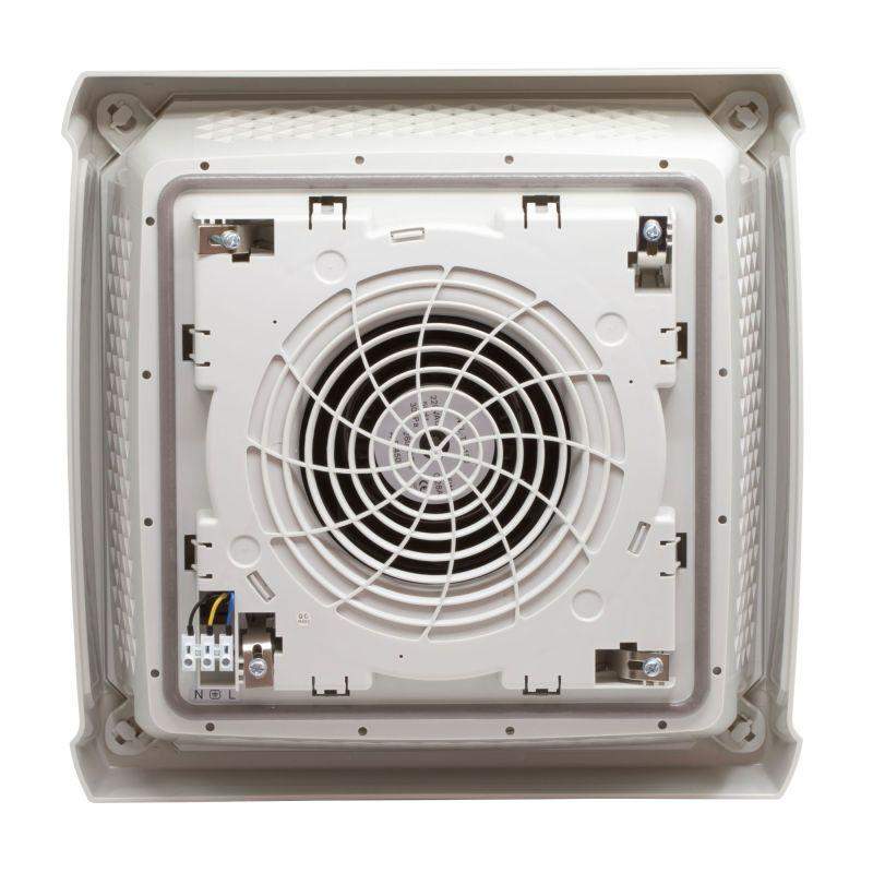 Потолочные вентиляторы обладают высоким качеством и надежностью, могут применяться даже в тяжелых условиях эксплуатации. Изготовлены из устойчивого к УФ и не поддерживающего горение АБС–пластика. Степень защиты IP55. Монтаж осуществляется при помощи защелок и дополнительных металических фиксаторов. Внешние габаритные размеры 400х400х135 мм. Размер монтажного выреза 258х258 мм. Номинальное напряжение питания 230 В с частотой 50/60 Гц. Номинальный воздушный поток с фильтром при 50/60 Гц составляет - 430/465 м3/ч, без использования фильтра - 570/620 м3/ч. Цвет - светло-серый, RAL 7035.