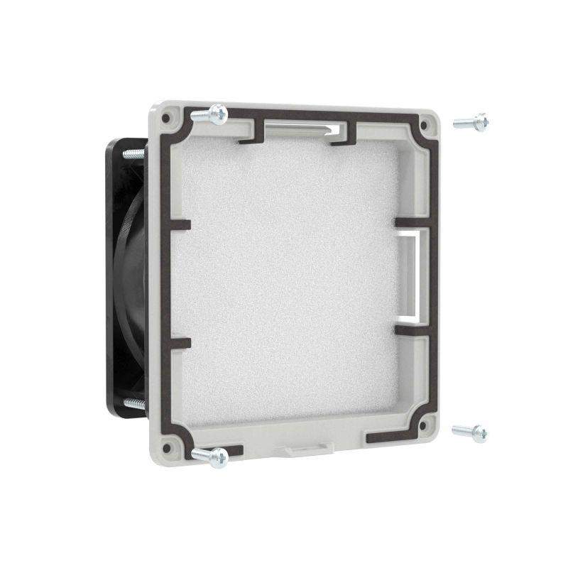 Вентиляторы RV изготовлены в России. Они обладают высоким качеством и надежностью, могут применяться даже в тяжелых условиях эксплуатации. Возможна работа на вдув или на выдув, благодаря простой смене направления вращения. Изготовлены из устойчивого к УФ и не поддерживающего горение АБС–пластика и поликарбоната. Допустима установка на улице без навеса. Степень защиты IP54, опционально повышение до IP56. Монтаж осуществляется без использования инструмента при помощи защелок (опционально можно зафиксировать винтами, например, при вибрационных нагрузках). В комплекте - воздушный фильтр с возможностью быстрой замены без инструмента. Внешние размеры 150х150 мм, размер монтажного выреза 124,5х124,5 мм. Номинальный воздушный поток при 50 Гц составляет 44 м3/ч. Цвет - светло-серый, RAL 7035.