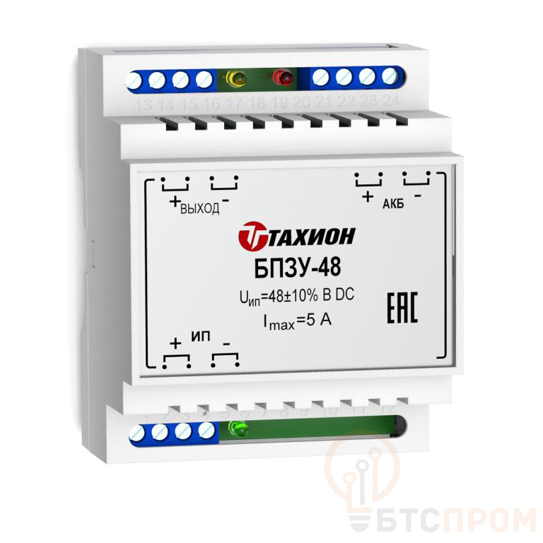 Блок переключения питания с зарядным устройством БПЗУ-48 предназначен для создания системы бесперебойного питания с использованием внешнего источника питания 48 В и четырех (пяти) подключенных последовательно 12 В аккумуляторных батарей (АКБ)