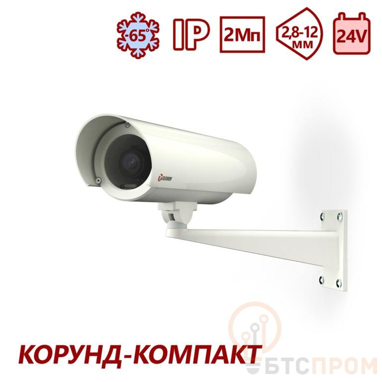 Компактная всепогодная видеокамера серии "Корунд-Компакт". Разрешение 1920х1080 (Full HD). Матрица 1/2,8” CMOS. Чувствительность 0,001лк/0,0001лк. Объектив: 2,8-12 мм. АРД. Электромеханический ИК-фильтр. Поддержка ONVIF. Формат сжатия: H.265+, H.265, H.264, MJPEG. Скорость потока: до 30 кадров/сек. Одновременная передача двух потоков. 3D-DNR. Класс защиты IP66/IP68. Диапазон рабочих температур, °C -65 ? +50. Потребляемая мощность 24,6Вт. Холодный пуск. Напряжение питания: 24VDC. В комплекте кронштейн крепления на стену. Ввод кабеля через гермовводы.