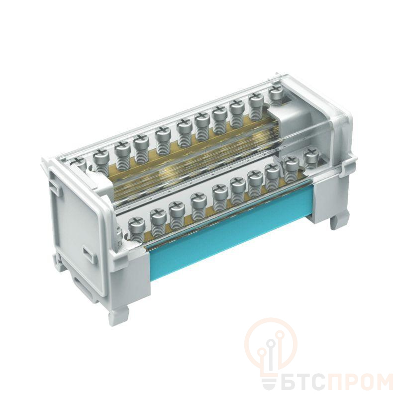 Предназначен для структурированного подключения отводных линий, разведения входящего проводника на несколько потребителей или участков. Позволяет создать упорядоченные системы распределения в электрощитах. Корпус блока выполнен из не поддерживающего горение полиамида PA6.6 и 2-х токоведущих шин в блоках 125 А, представляющие собой бруски из латуни с 11-ю отверстиями, в которые вставляются провода и зажимаются винтом. Избежать случайного прикосновения к токоведущим частям позволяет защитный экран на корпусе блока. Наличие задней крышки для предотвращения контакта с DIN-рейкой или металлической поверхностью сзади.